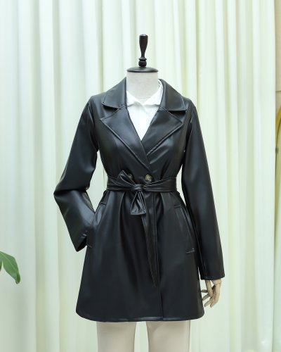 Tek Düğmeli Cepli Belden Bağlamalı Deri Trençkot Siyah